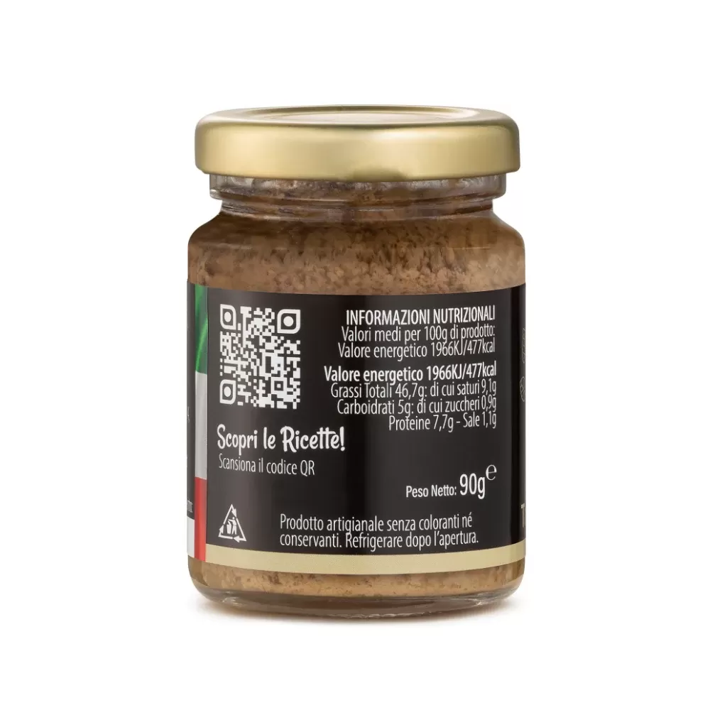 Noci, Formaggio Grana, Tartufo Nero Pregiato (Tuber melanosporum) 5%, Olio di Oliva, Sale, Fibre.