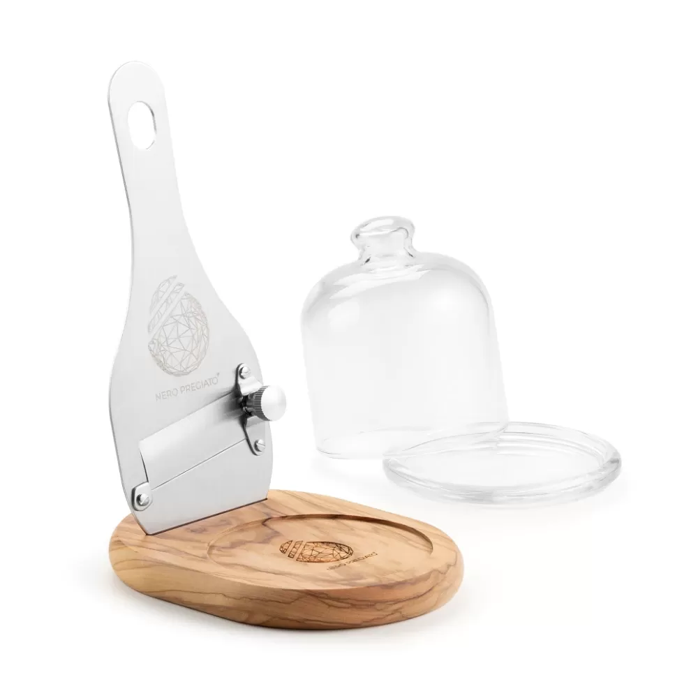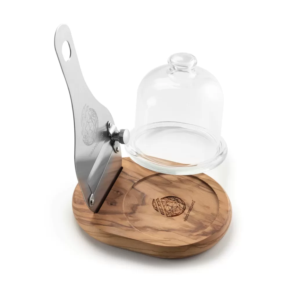 Servitartufi composto da campana di vetro appoggiata sulla base in legno di Ulivo Italiano con sede dedicata al affetta tartufi inox lama liscia incluso.